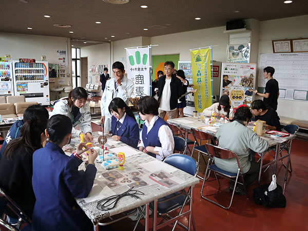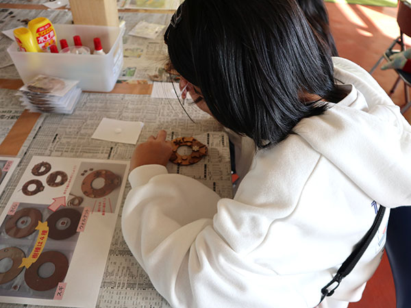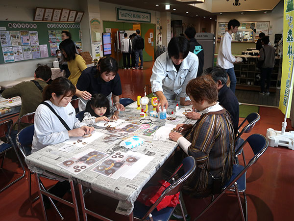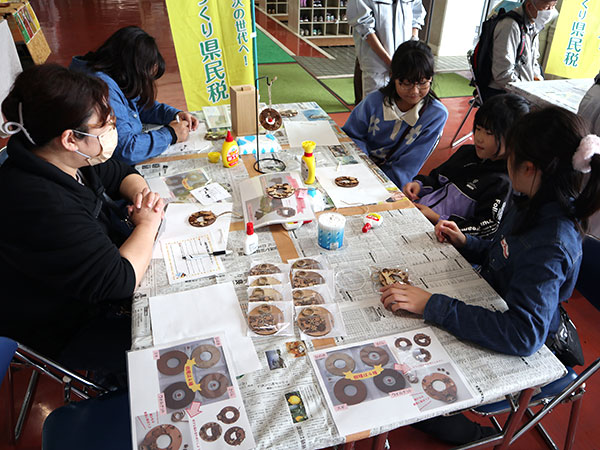 水源涵養林パネルの展示、木のクリスマスミニリースづくりを体験し、木材の有効利用などについて学ぶ機会となりました。