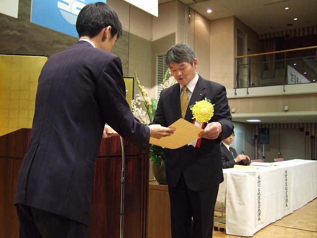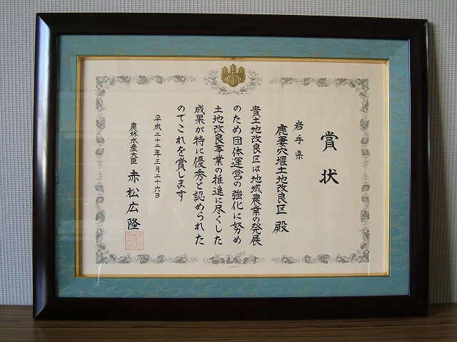 東京都千代田区 砂防会館(シェーンバッハサボー)で開催された全国水土里ネット表彰式において当区が農林水産大臣表彰(優良土地改良区)を受賞しました。都市化・混住化に対する関係機関との連絡調整、アドプトによる協働奉仕活動、水源涵養林の保育活動等が評価されての受賞です。今後も総代・役職員一丸となり一層の努力をして参ります。