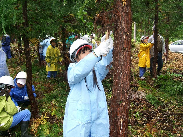 雫石町鴬宿にある土地改良区所有の水源涵養林内において、枝打ち体験学習会を開催しました。学習会直前まで雨模様のもと、矢巾町立徳田小学校4年生と関係者72名が参加しました。植えてから11年経過したスギの枝打ちをして、水源涵養林の大切さなどを学びました。