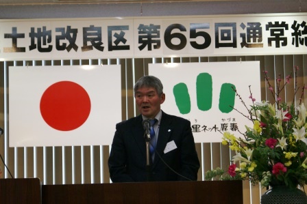 平成27年3月6日午後1時30分より鹿妻穴堰土地改良区大会議室において第65回通常総代会を開催しました。総代現員数60名の出席を得て、来賓に東北農政局北上土地改良調査管理事務所長 合屋英之氏、岩手県盛岡広域振興局農政部農村整備室長 佐藤雄功氏、盛岡市長代理 農林部次長 畑澤修一氏、矢巾町長 川村光朗氏を迎え、議長に吉田長之総代(盛岡市太田地区)を選出し、鹿妻穴堰土地改良区定款の一部変更について等34案件について審議がなされ、いずれも原案のとおり承認、可決されました。