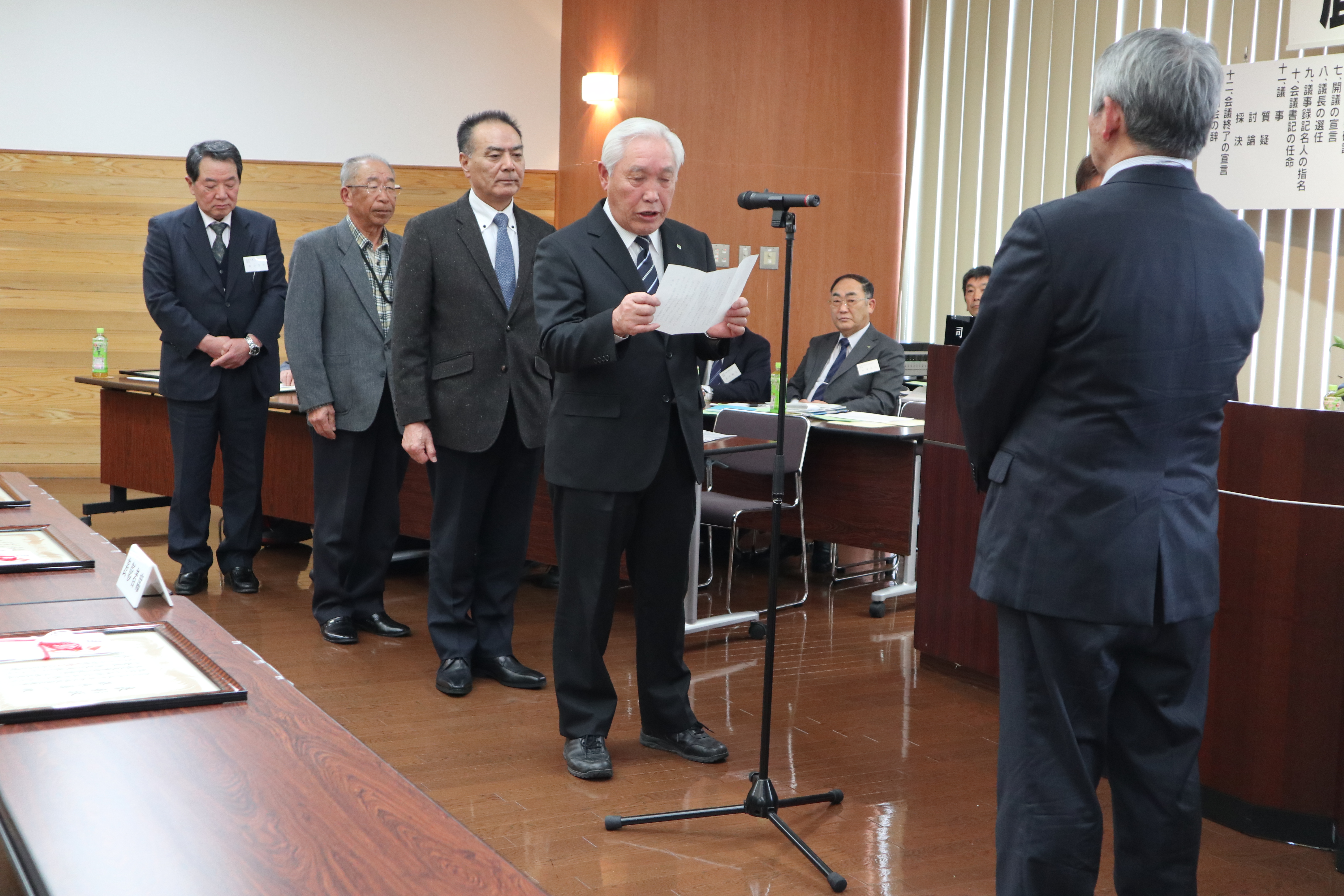 総代現員数66名中65名の出席のもと、来賓に東北農政局北上土地改良調査管理事務所次長 木村俊逸氏、岩手県盛岡広域振興局農政部農村整備室長 菊池 力氏、管理用地課長 照井博幸氏、盛岡市農林部長 長澤秀則氏、矢巾町産業振興課長 菅原弘範氏、紫波町産業部農政企画室長 浦田文伸氏を迎え土地改良区功績者表彰の後、議長に舘澤 実総代(盛岡市太田地区)を選出し、専決処分の承認について等13案件について審議がなされ、いずれも原案のとおり承認可決されました。
