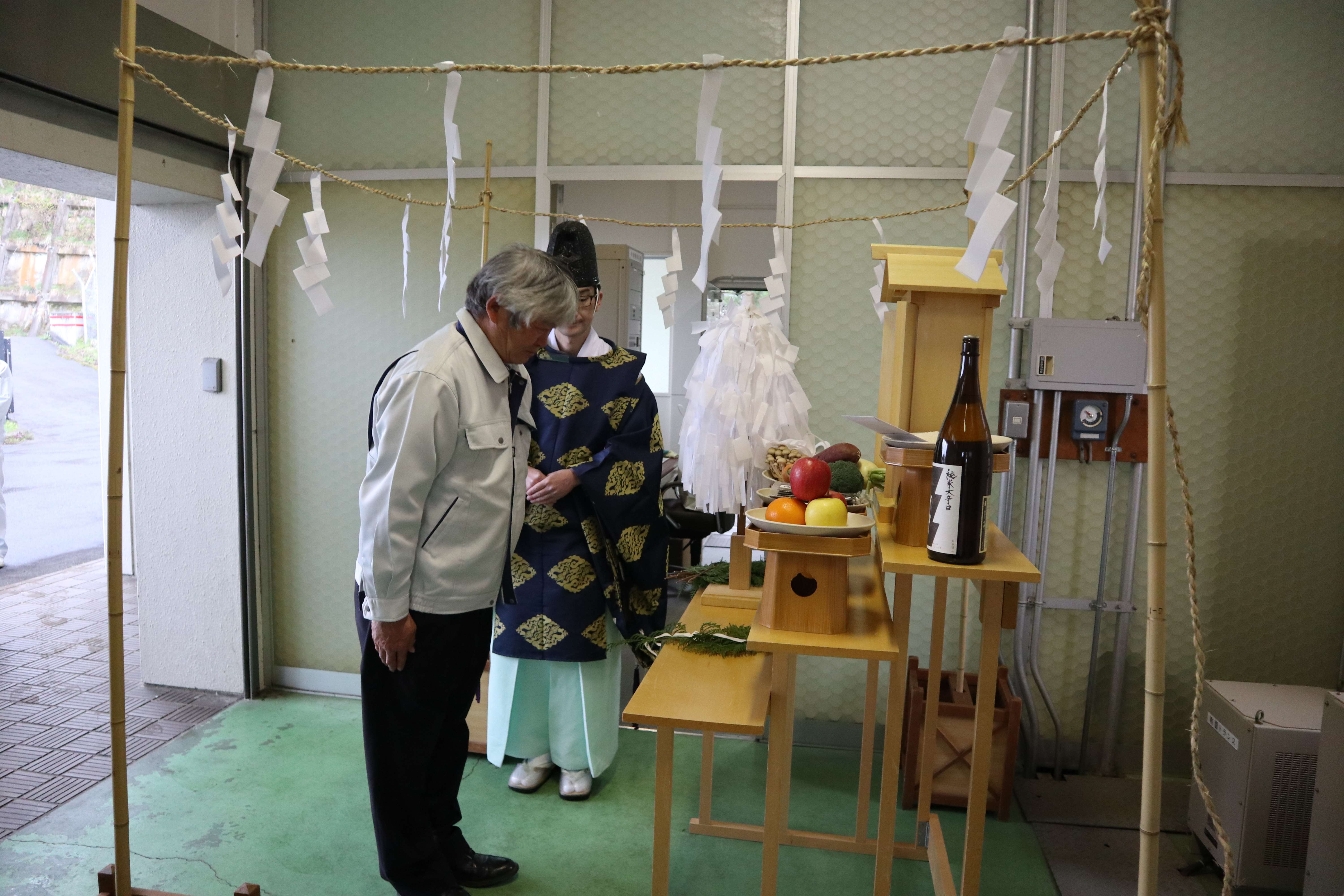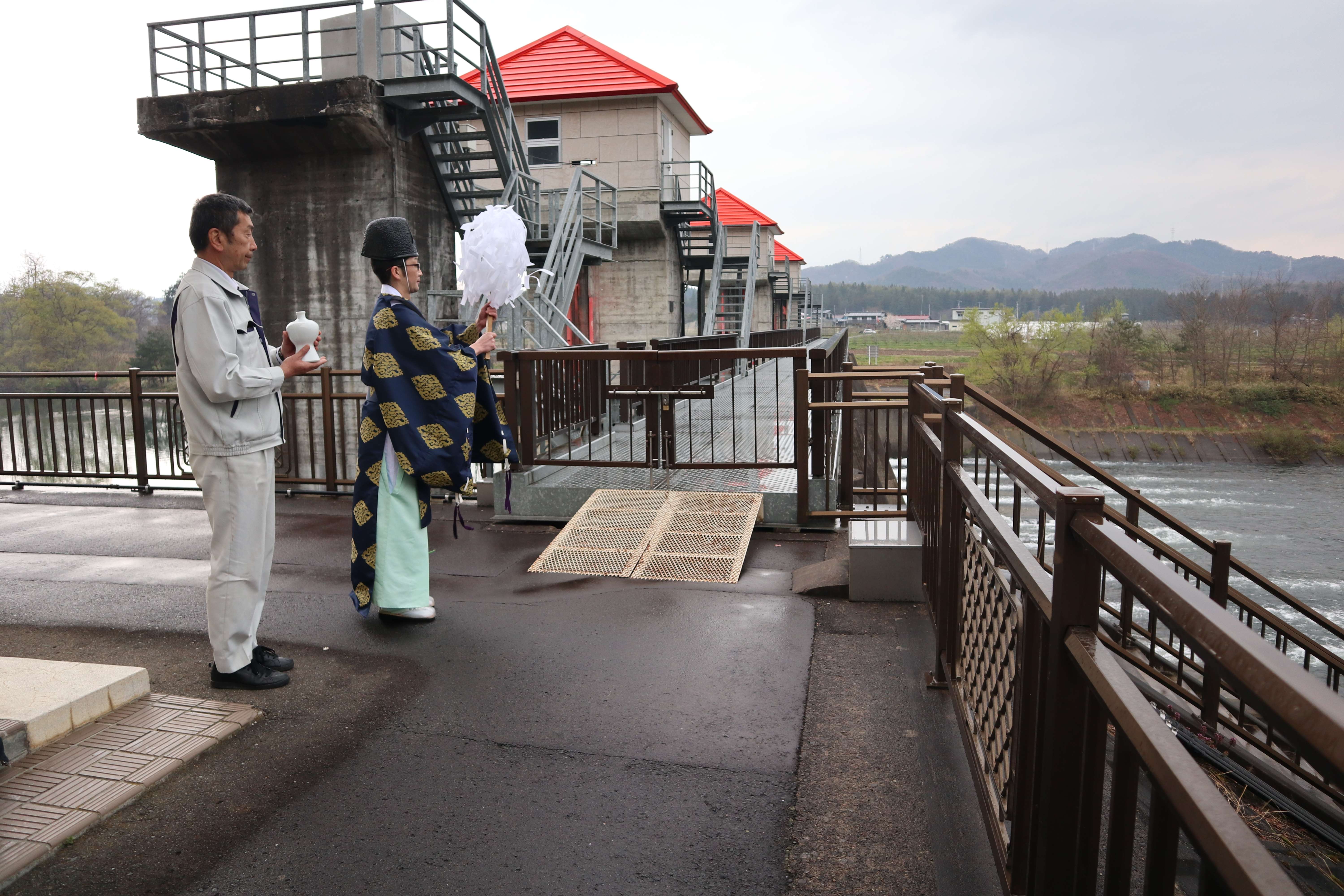 鹿妻穴堰通水安全祈願神事を盛岡市上太田にある鹿妻穴堰頭首工でおこないました。当日は小雨のもと当土地改良区役職員19名が出席し、通水の安全と五穀豊穣を祈願しました。