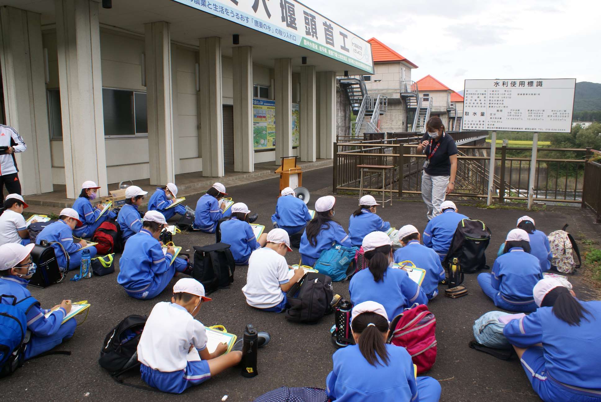 体験学習のあとは鹿妻穴堰頭首工に移動し、水源涵養林で育まれた農業用水がどのようにして農地に届いている等を見学しました。