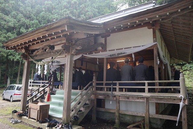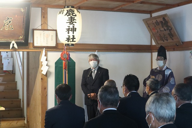 盛岡市猪去地内の鹿妻神社において鹿妻穴堰通水五穀豊穣式典が行われました。当日は小雨まじりのお天気のなか氏子総代並びに関係者約50名の出席により、五穀豊穣と鹿妻穴堰を開鑿したとされる鎌津田甚六を称え神事が執り行われました。