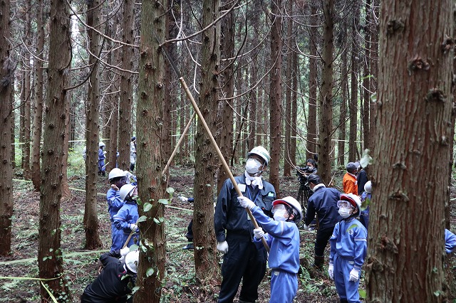 作業前には盛岡広域振興局林務部が森林機能と管理の重要性、盛岡広域森林組合が枝打ちの方法を説明しました。