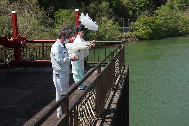 鹿妻穴堰通水安全祈願神事を盛岡市上太田にある鹿妻穴堰頭首工でおこないました。本年も新型コロナウイルス感染症対策をとり、北上川ダム統合管理事務所、北上土地改良調査管理事務所、岩手県農林水産部、岩手県盛岡広域振興局、岩手県企業局、盛岡市、矢巾町、紫波町、岩手県土地改良事業団体連合会、岩手中央農業協同組合、土地改良区関係者の約30名が出席し、通水の安全と五穀豊穣を祈願しました。
